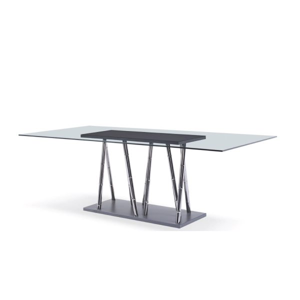 Metropolis Dining Table, 12mm Tempered Clear Glass Top, Black Metal Base Bamboo Design with MDF and Metal Connection painted in Matt Gray Color W0003000-1.