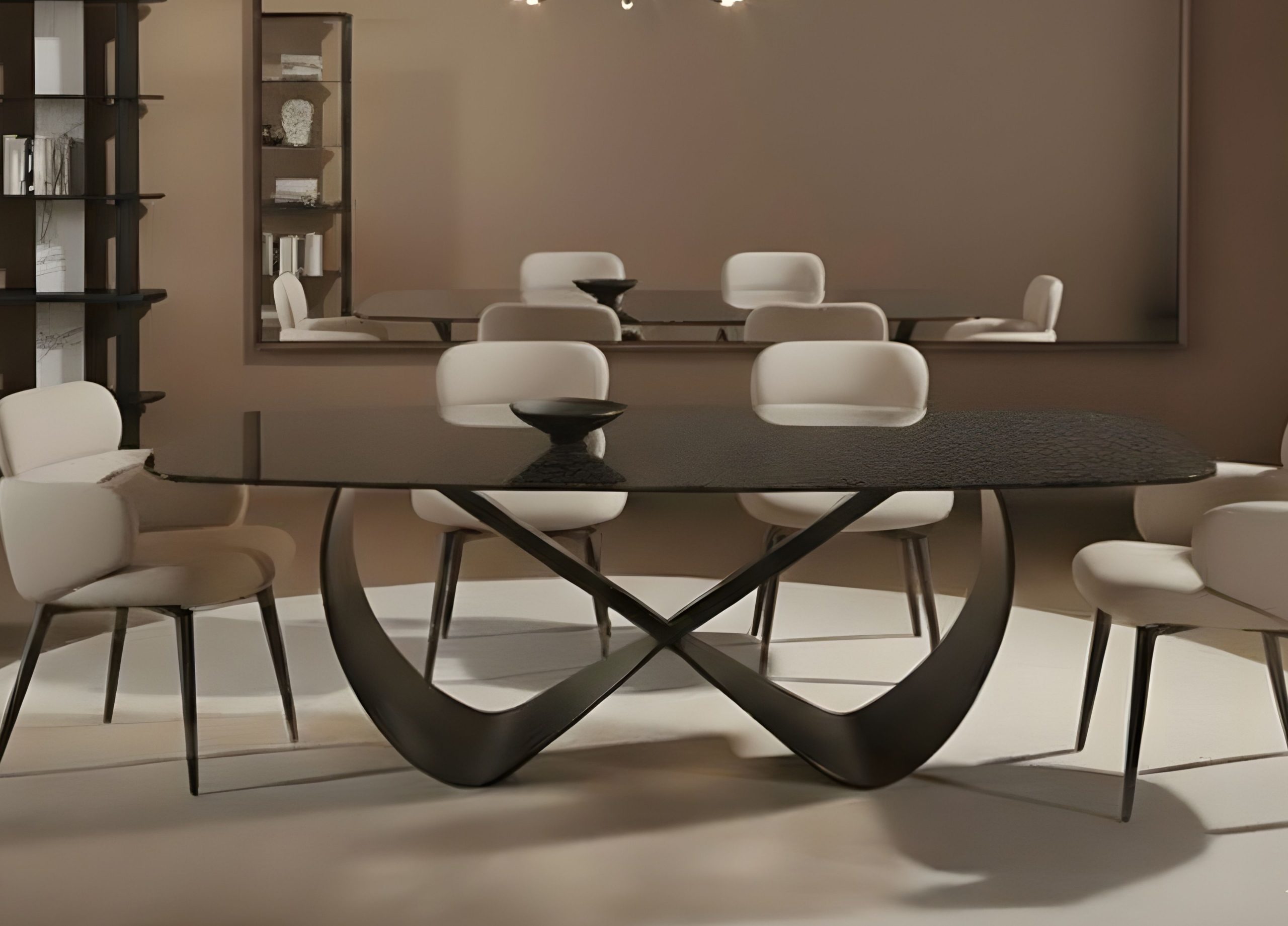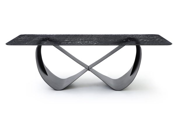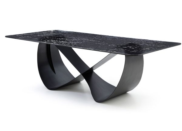 The curved and sinuous legs and the crosspiece that define the base, enriching the overall design of the Tiffany dining table, making it a figurative artistic piece.