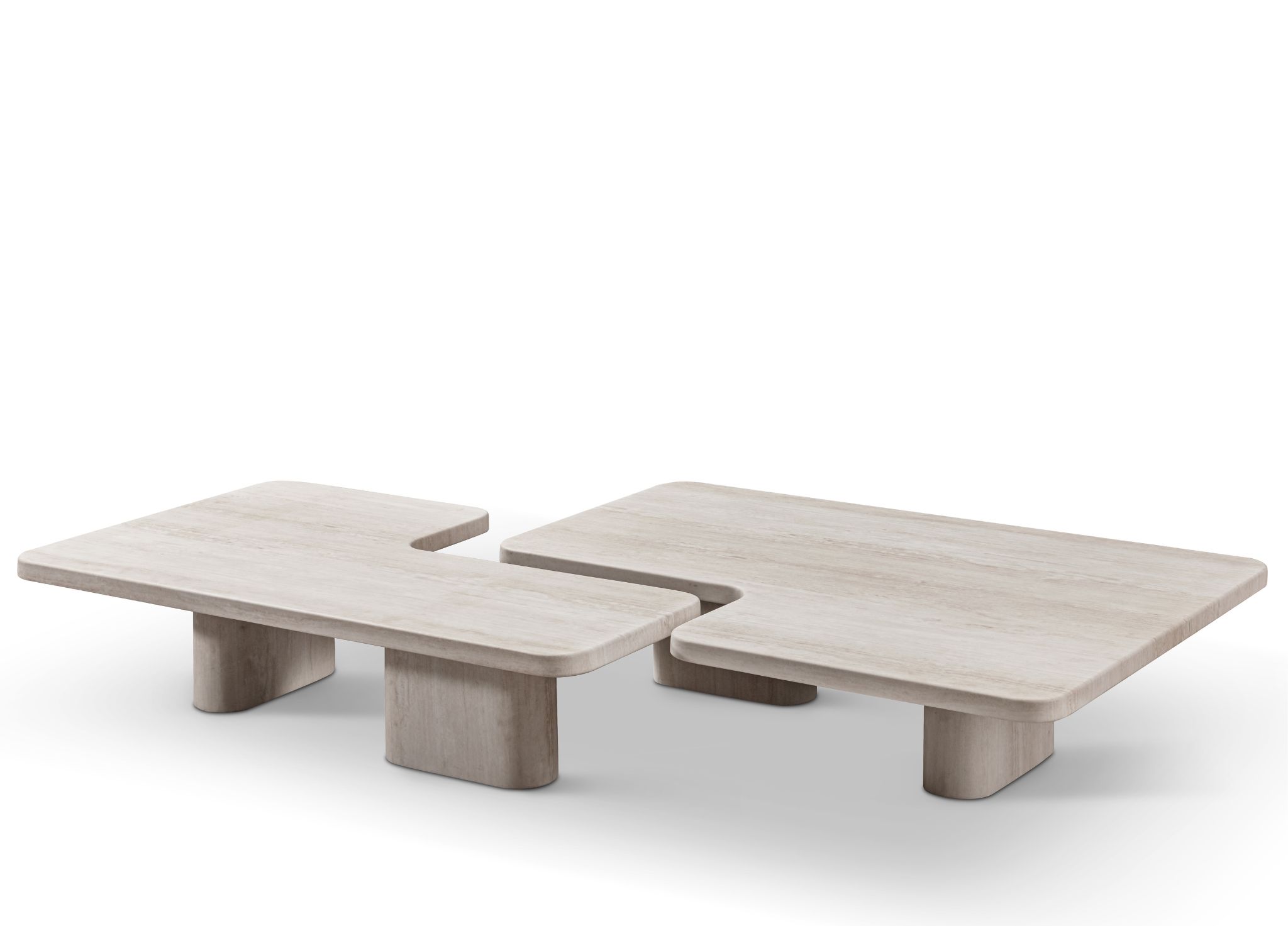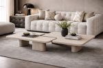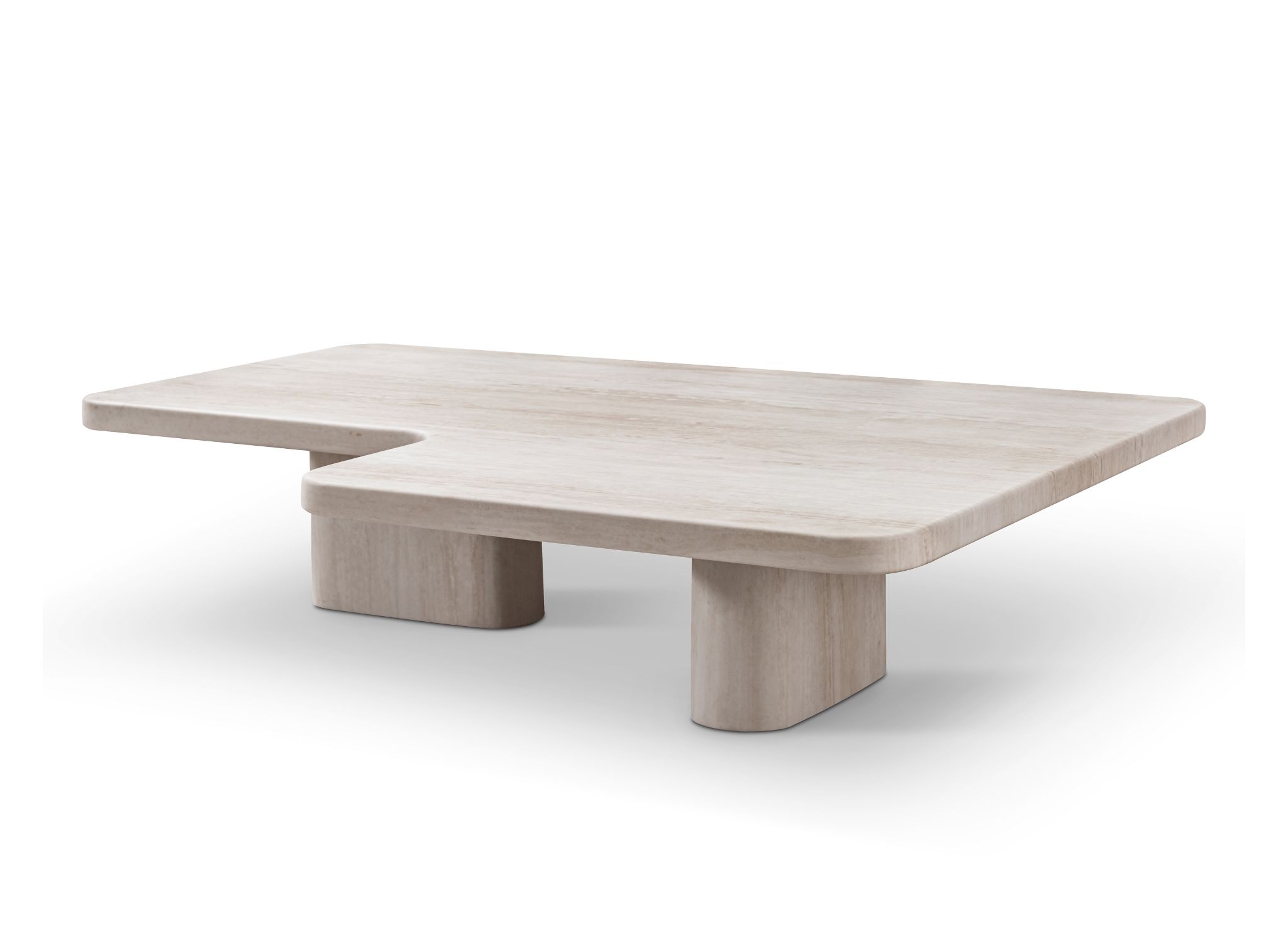 The Mosaic Coffee Table Is A Masterclass In Geometric Balance And Sculptural Simplicity.Finished in Travertine Marble Matte, Its Distinct L-Shaped Silhouette Introduces A Modern Architectural Edge. Resting On Two Strong Pill-Shaped Pedestals, It Brings Timeless Character And Sculptural Presence To Living Rooms And Designer Projects.
