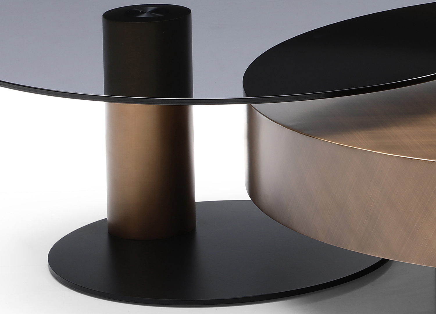 Renata Round Coffee Table, Set of Two Tables, High Table Swivel Top in 10mm Smokey Glass, Base in Sanded Black Powder-Coated Steel, Low Table in Brushed Metal Bronze with Grid Lines.