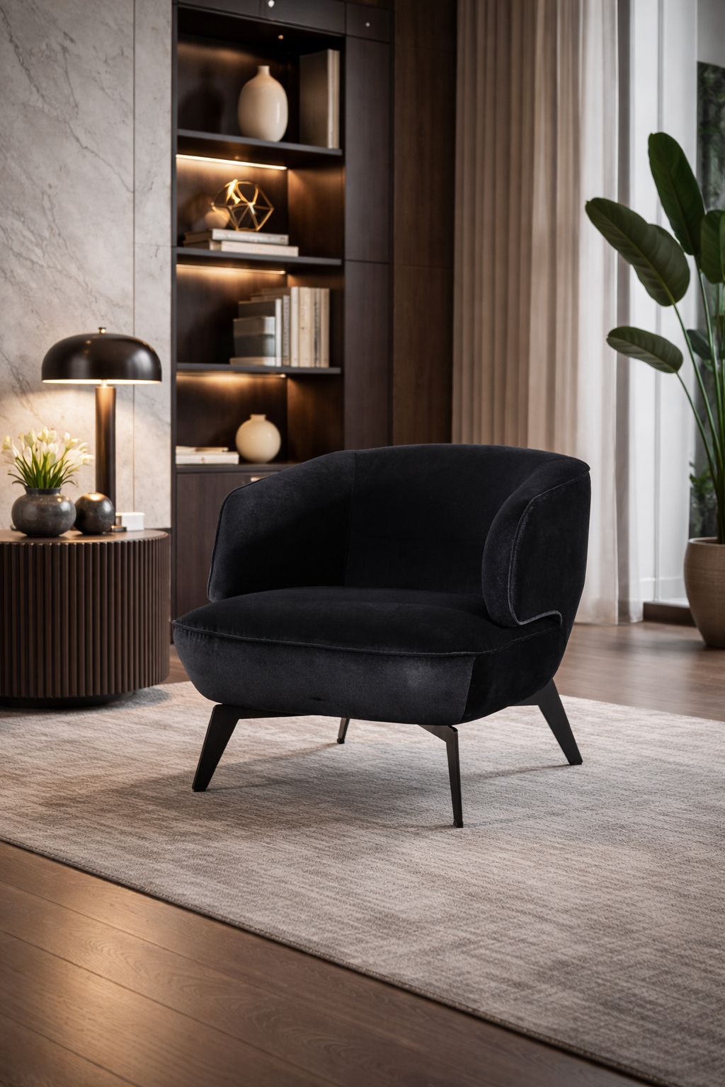 Mersin Accent Chair, Available in Red Velvet or Black Velvet, Legs in Matt Black Powder-Coated Steel.