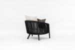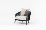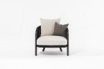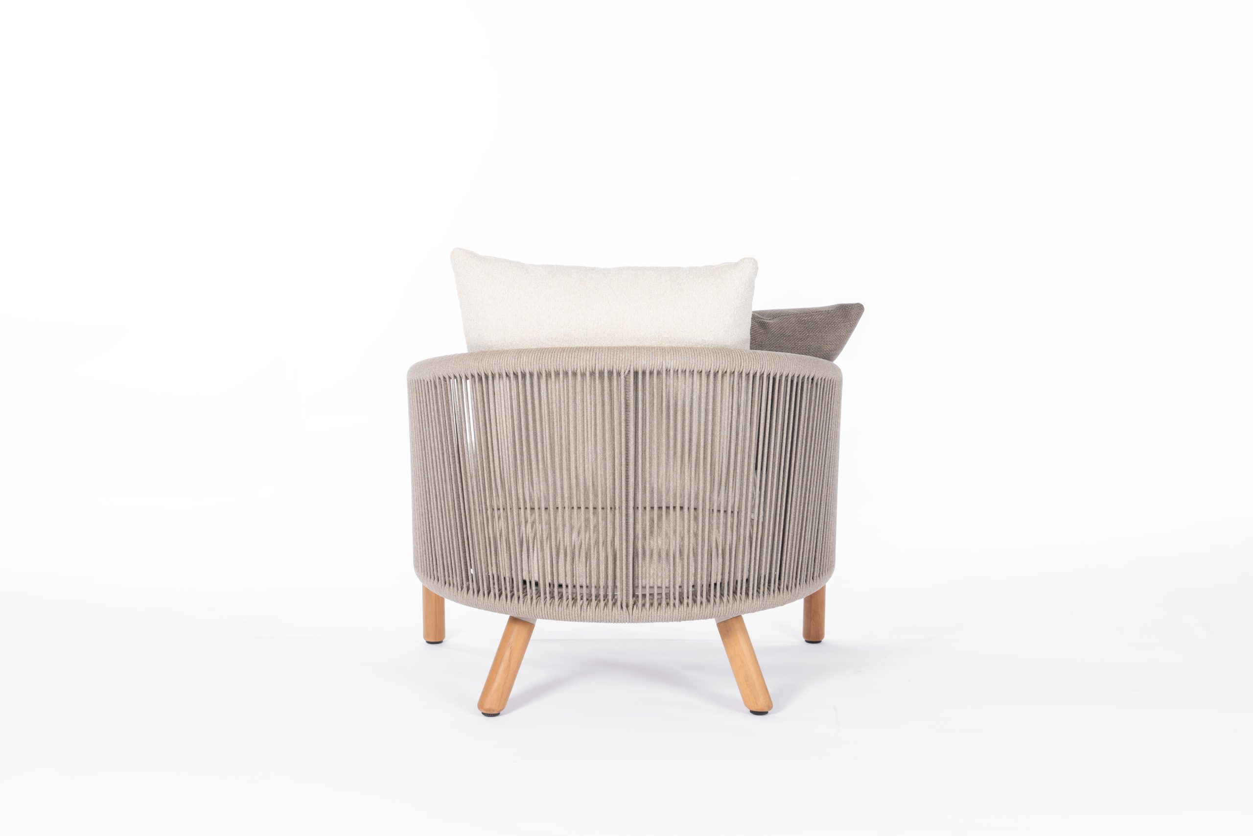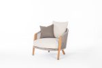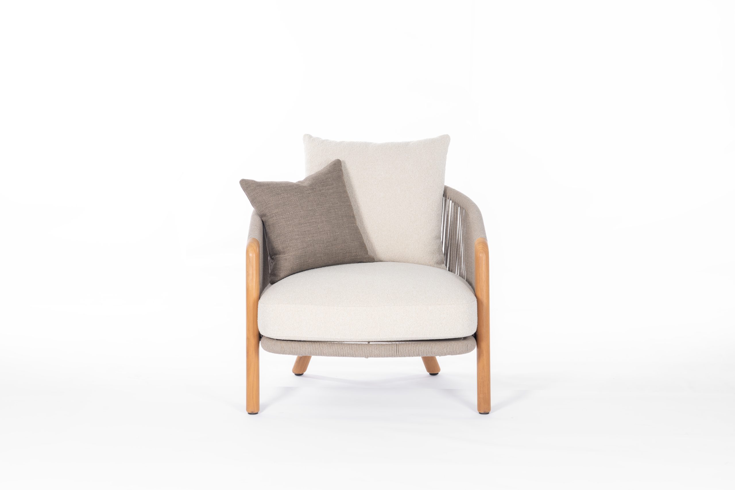 - Aluminum Mocha Frame, Upholstered in Mocha Fabric, 6mm Olefin Mocha Rope Back, With FSC Teak legs, 2 Cushion.