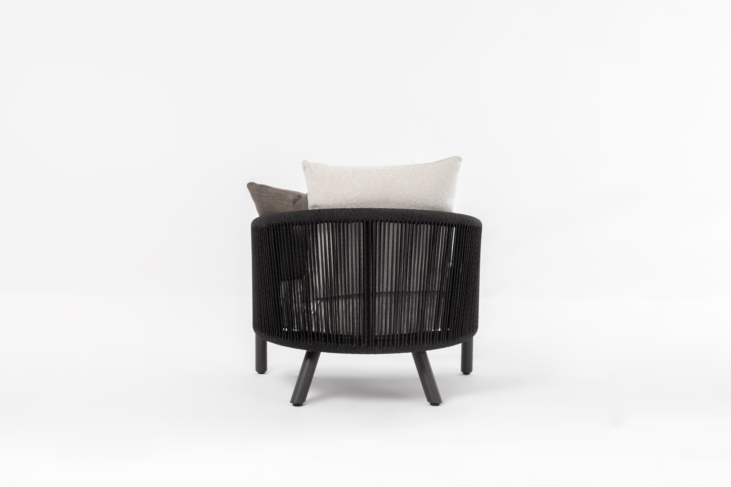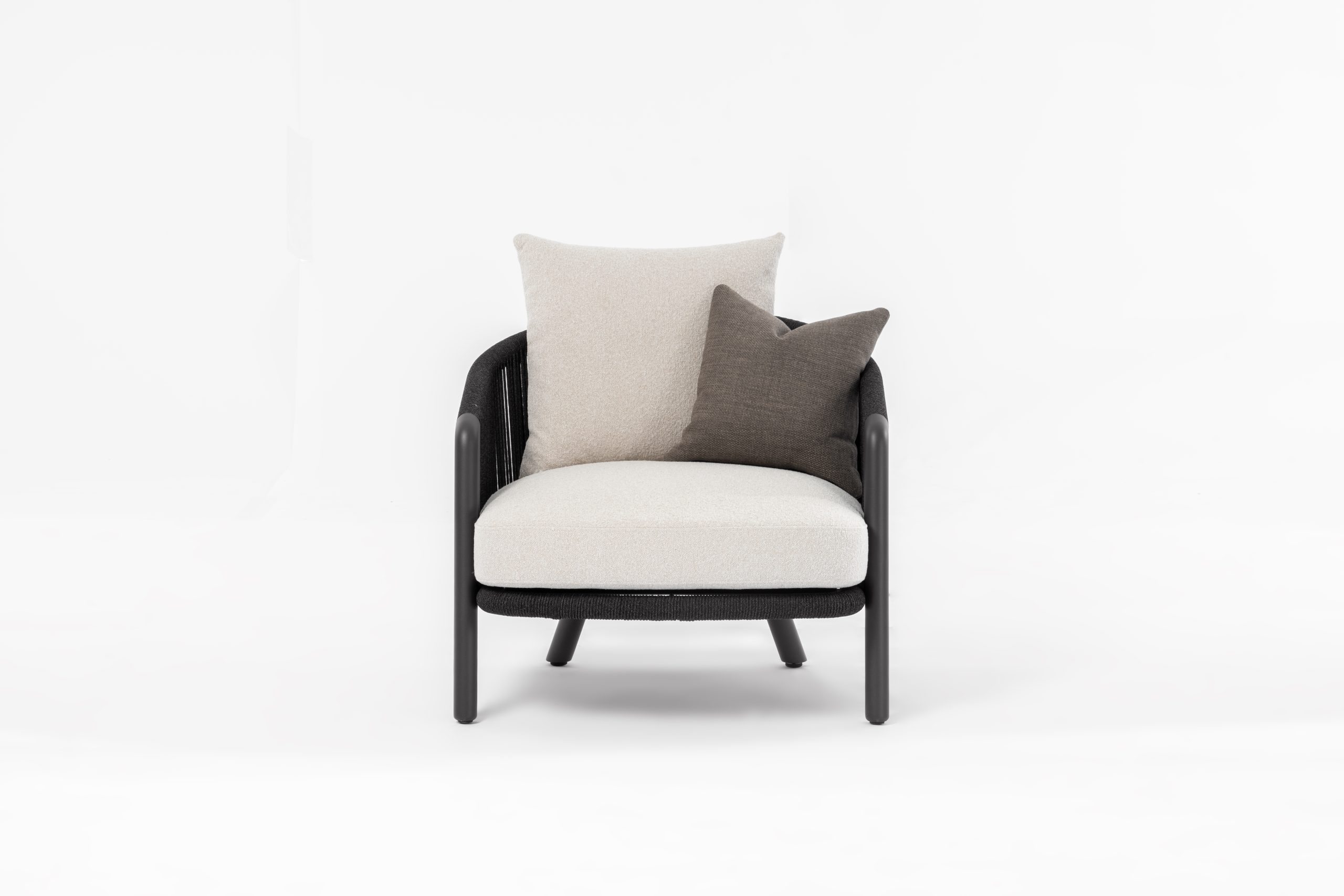 - Aluminum Charcoal Frame , Upholstered in Light Grey Fabric MH-1763, 6mm Olefin Black Rope Back , 2 Cushions 40x40cm, 1 Cushion 30x50cm.