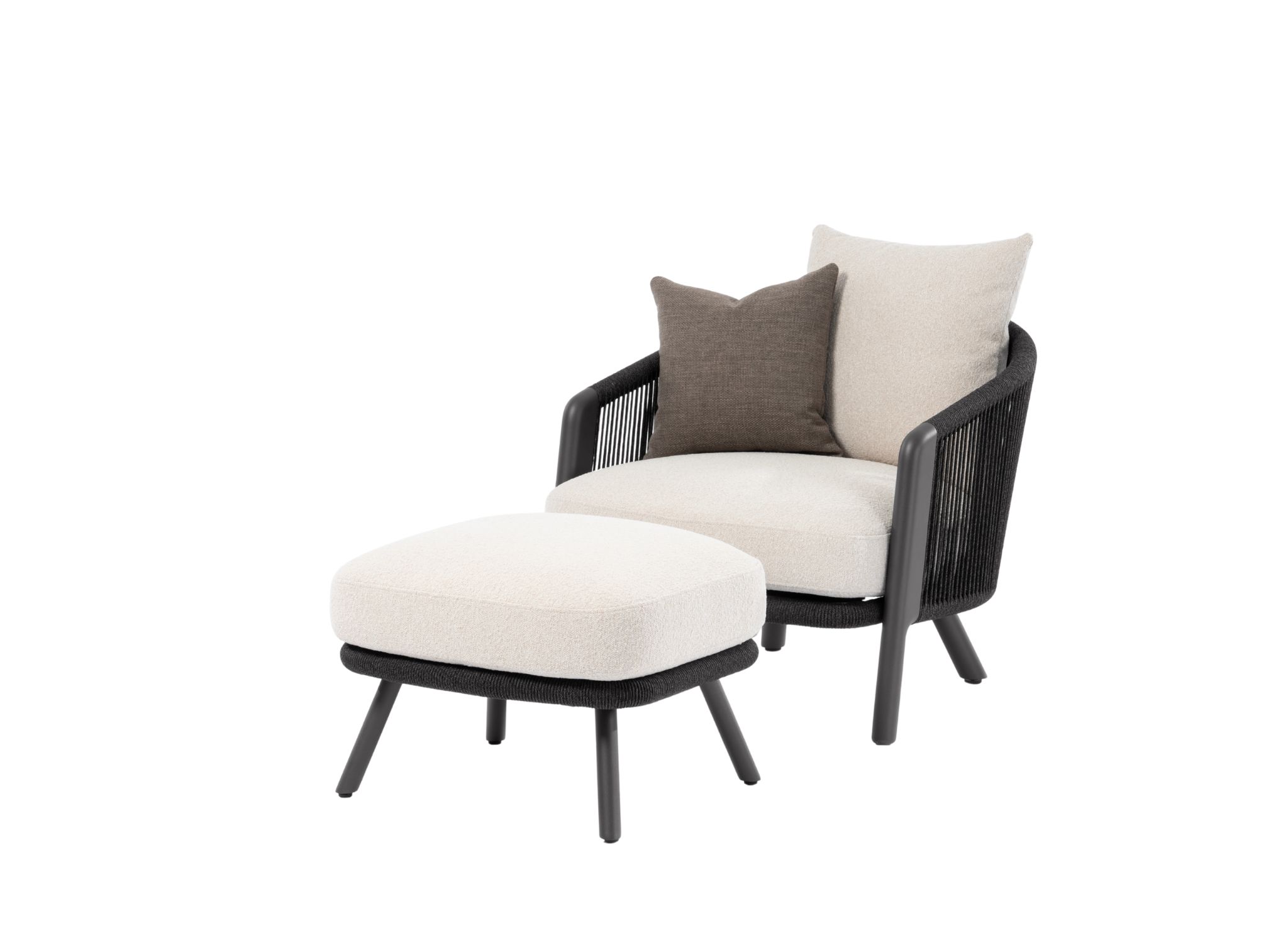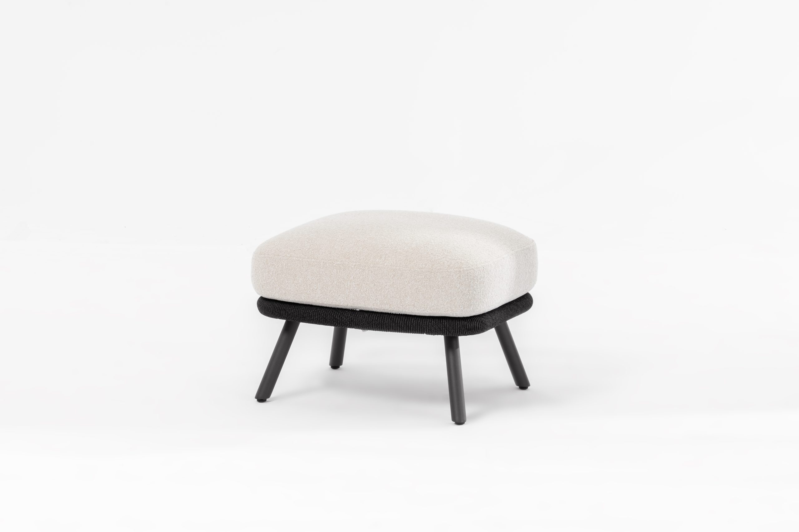 - Aluminum Charcoal Frame , Upholstered in Light Grey Fabric MH-1763, 6mm Olefin Black Rope Back , 2 Cushions 40x40cm, 1 Cushion 30x50cm.