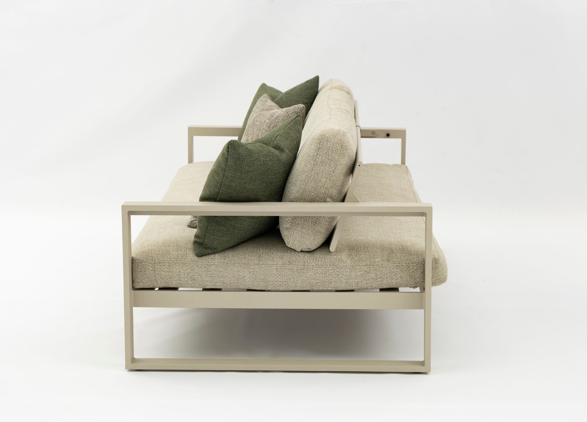 Costa 3 Seater Sofa, Mocha Aluminum Frame, Upholstered in Light Grey Fabric, 2 green cushions 50x50cm and 2 gray cushions 40x40cm.