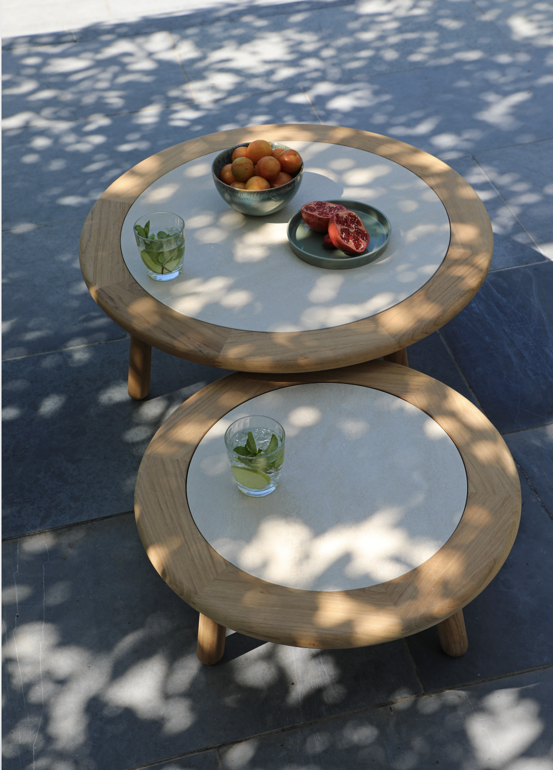 Haven Coffee Table available in 2 sizes, Small and Large, Fsc Teak Frame and Legs, With 6mm Beige Ceramic Top
