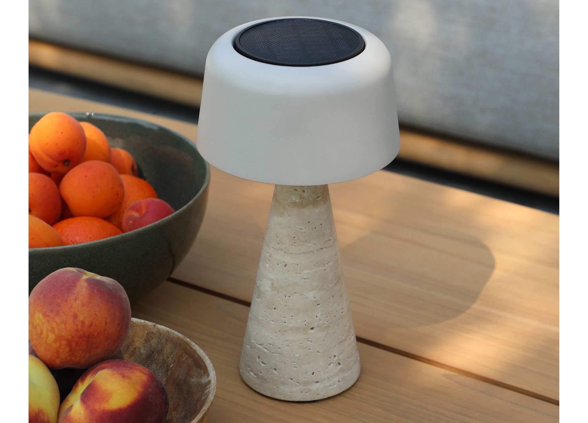 Light up your outdoors with the Spark Lamp. With a mocha finish and a travertine stone base, it effortlessly enhances evening ambiance. Enjoy warm white illumination with three adjustable brightness levels, perfect for patios, poolside lounging, or garden pathways. Completely portable and wire-free, it can be placed anywhere with no installation required. Solar-powered and USB-C rechargeable, the Spark Lamp is weatherproof, offering a blend of style, convenience, and durable outdoor lighting.