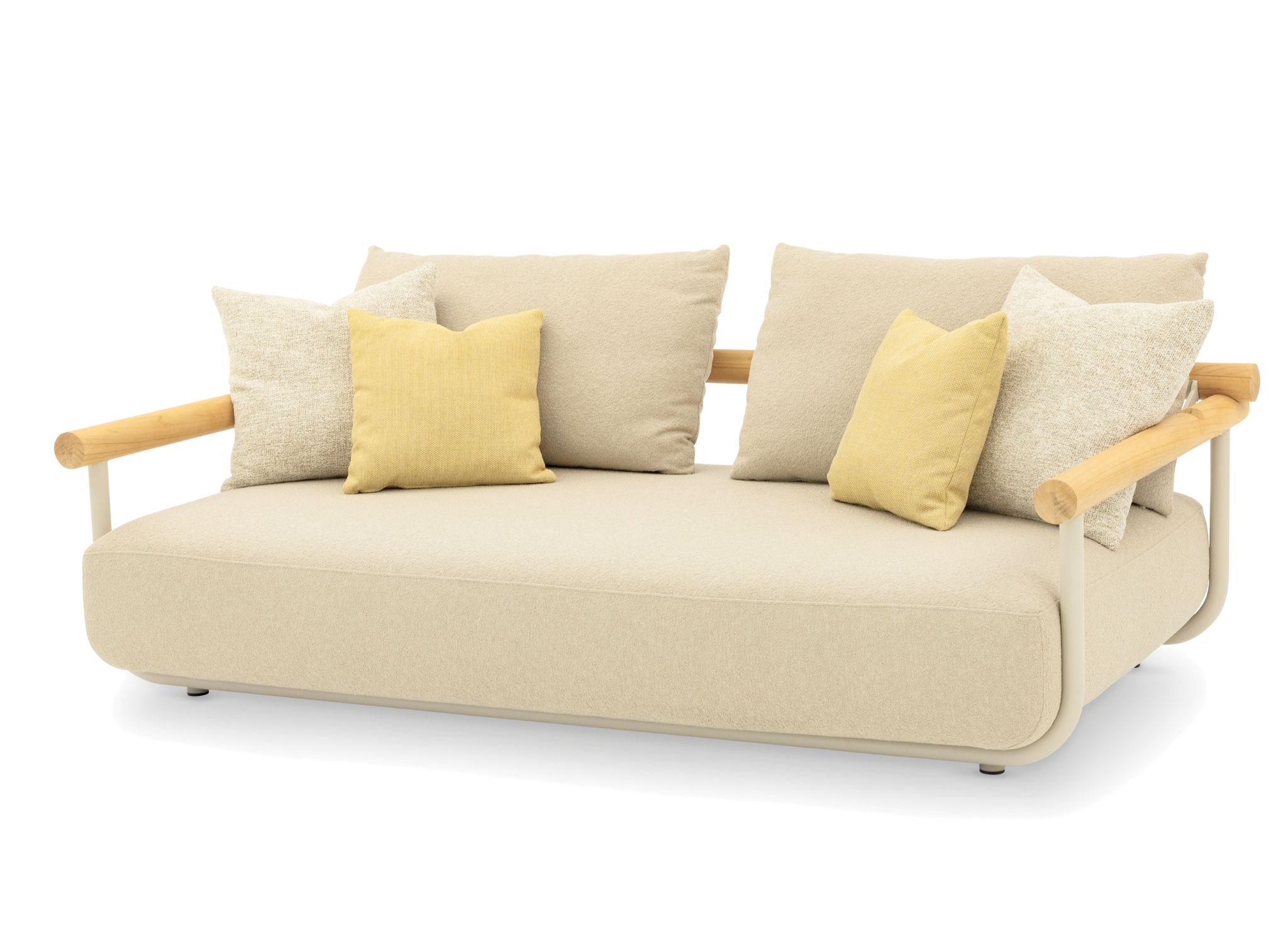 Orbit Three Seater Sofa, Mocha Aluminum + FSC Teak Frame, Upholstered in Olefin Fabric, With 2 Pillow.