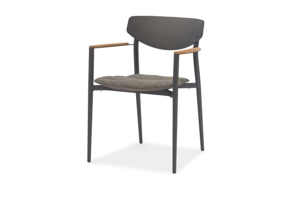 Timo Dining Armchair, Charcoal Aluminum Frame, FSC Teak Armrest, with Sunproof Fabric Seat Cushion.