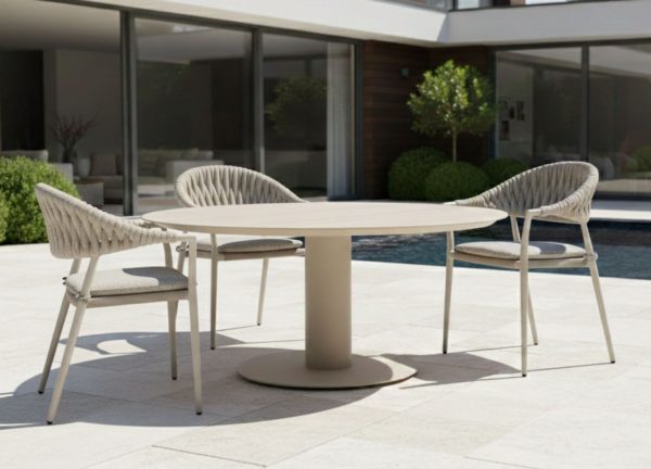 Tube round outdoor dining table featuring a beige ceramic top and a mocha aluminum base, offering a clean, modern look with durable, weather-resistant materials. Designed for elegant outdoor dining in both residential and hospitality spaces