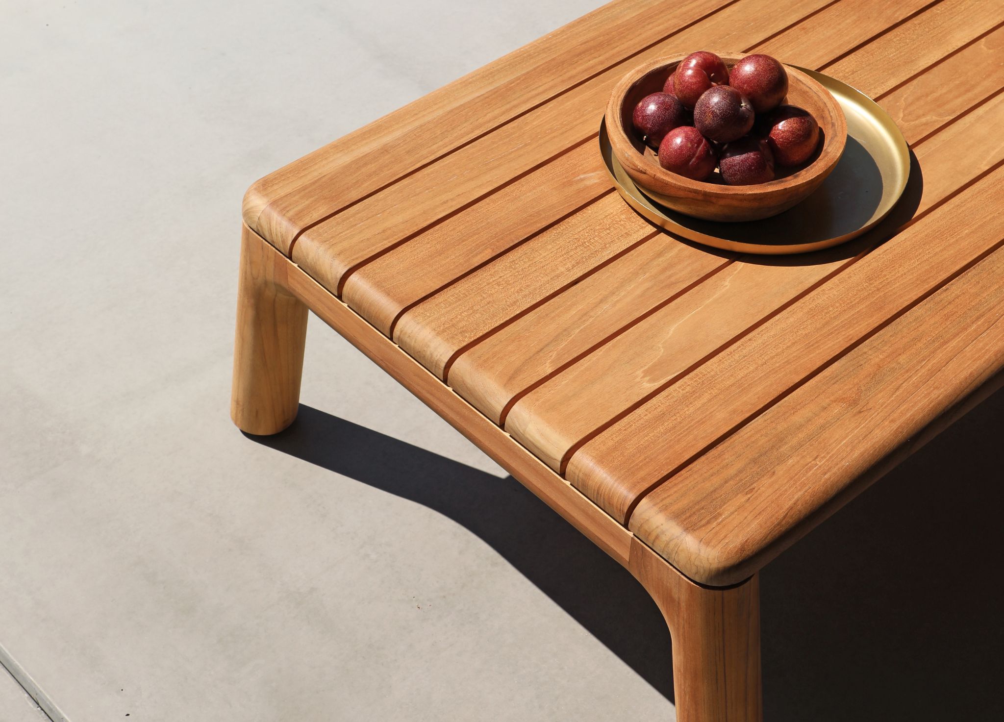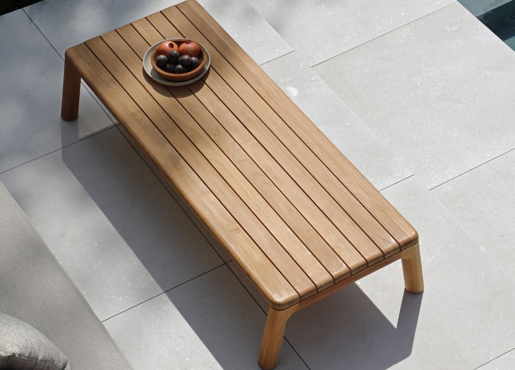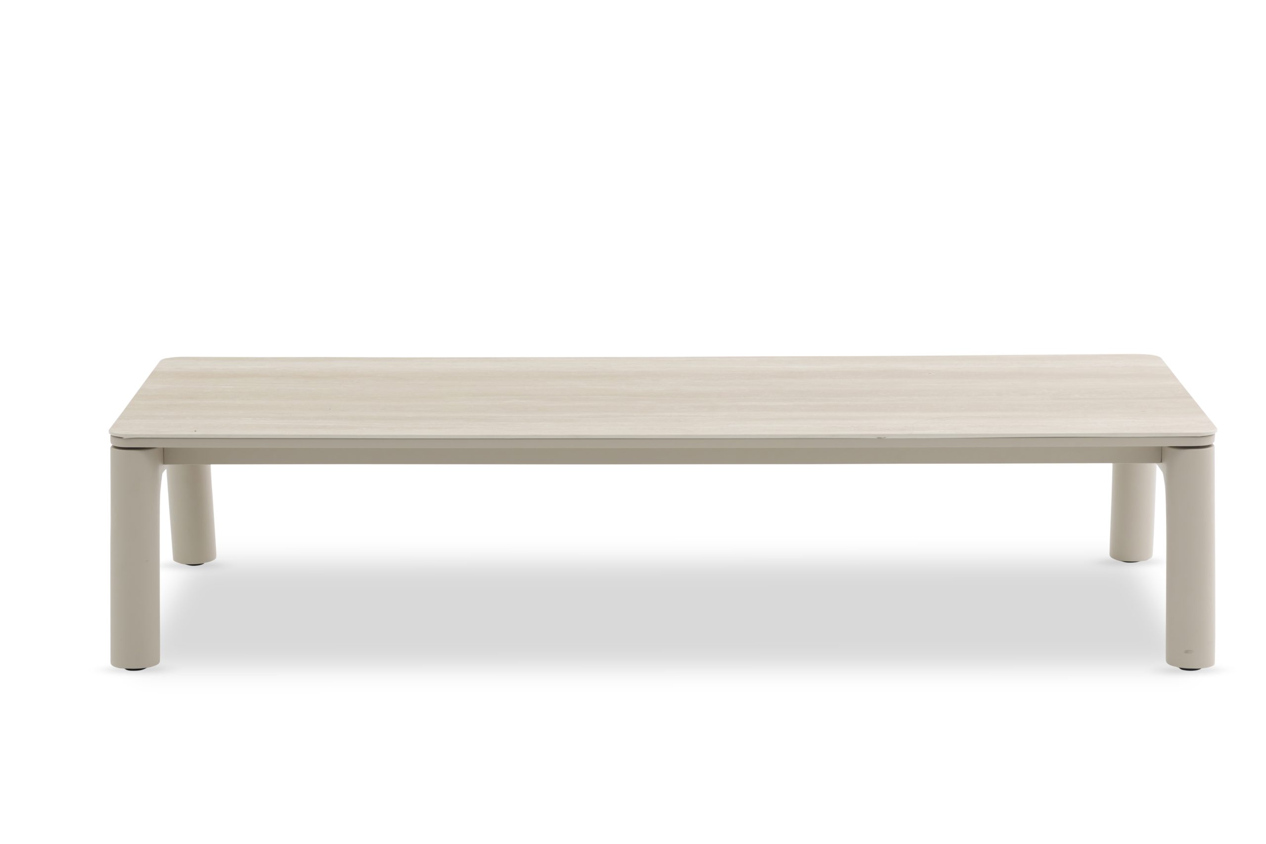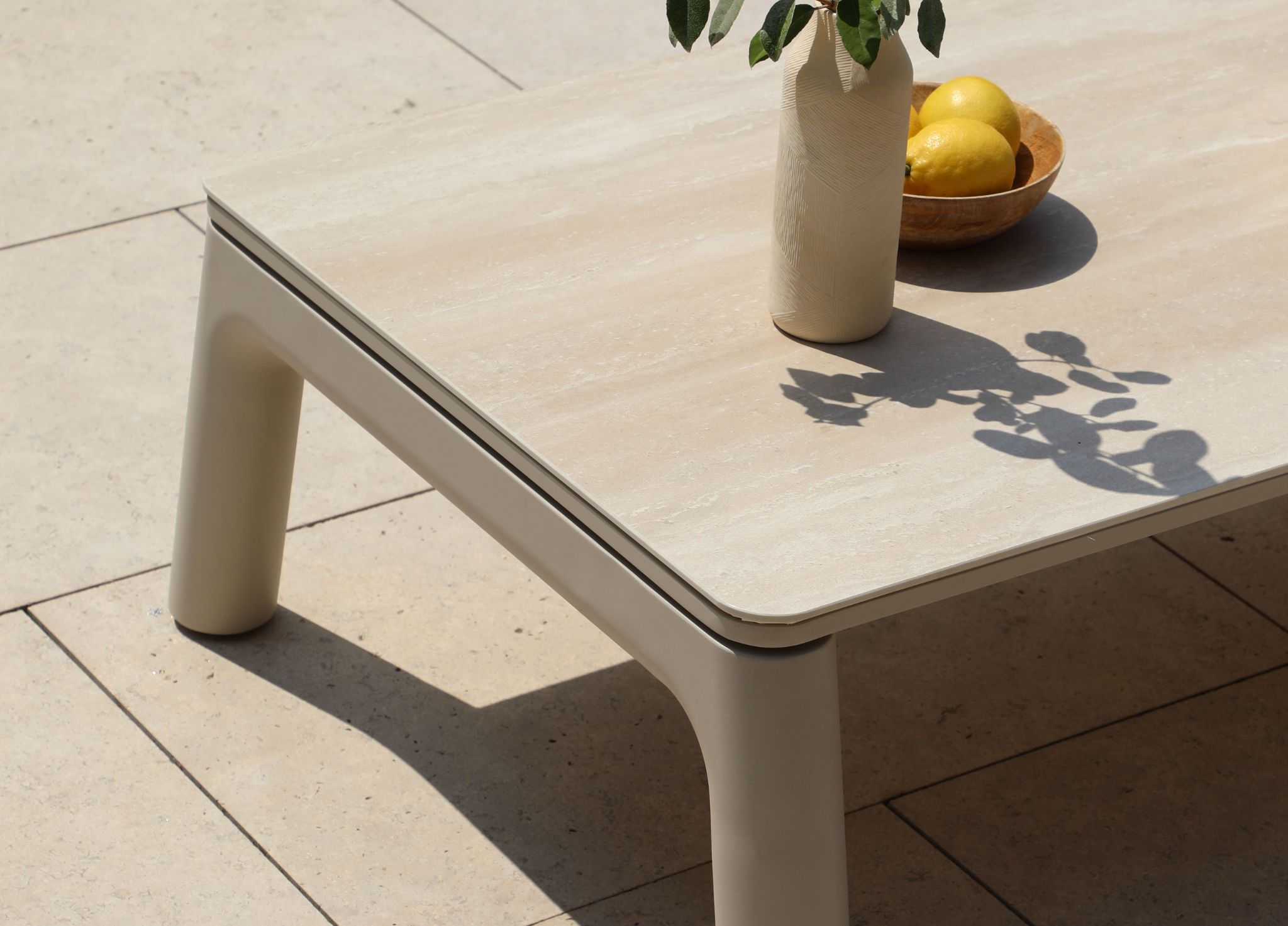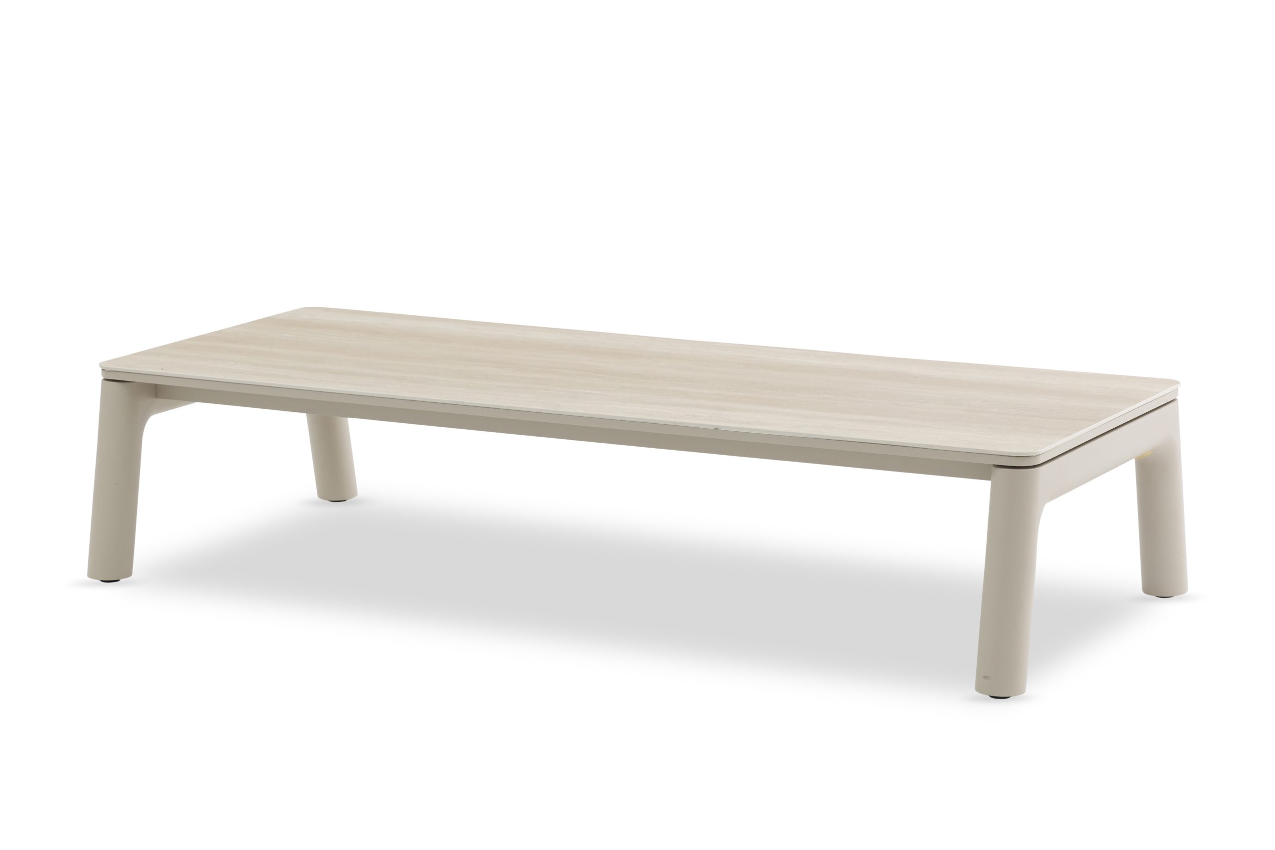 Tolo Coffee Table, available in Mocha Aluminum Frame With Beige Ceramic Top or FSC Teak Wood.