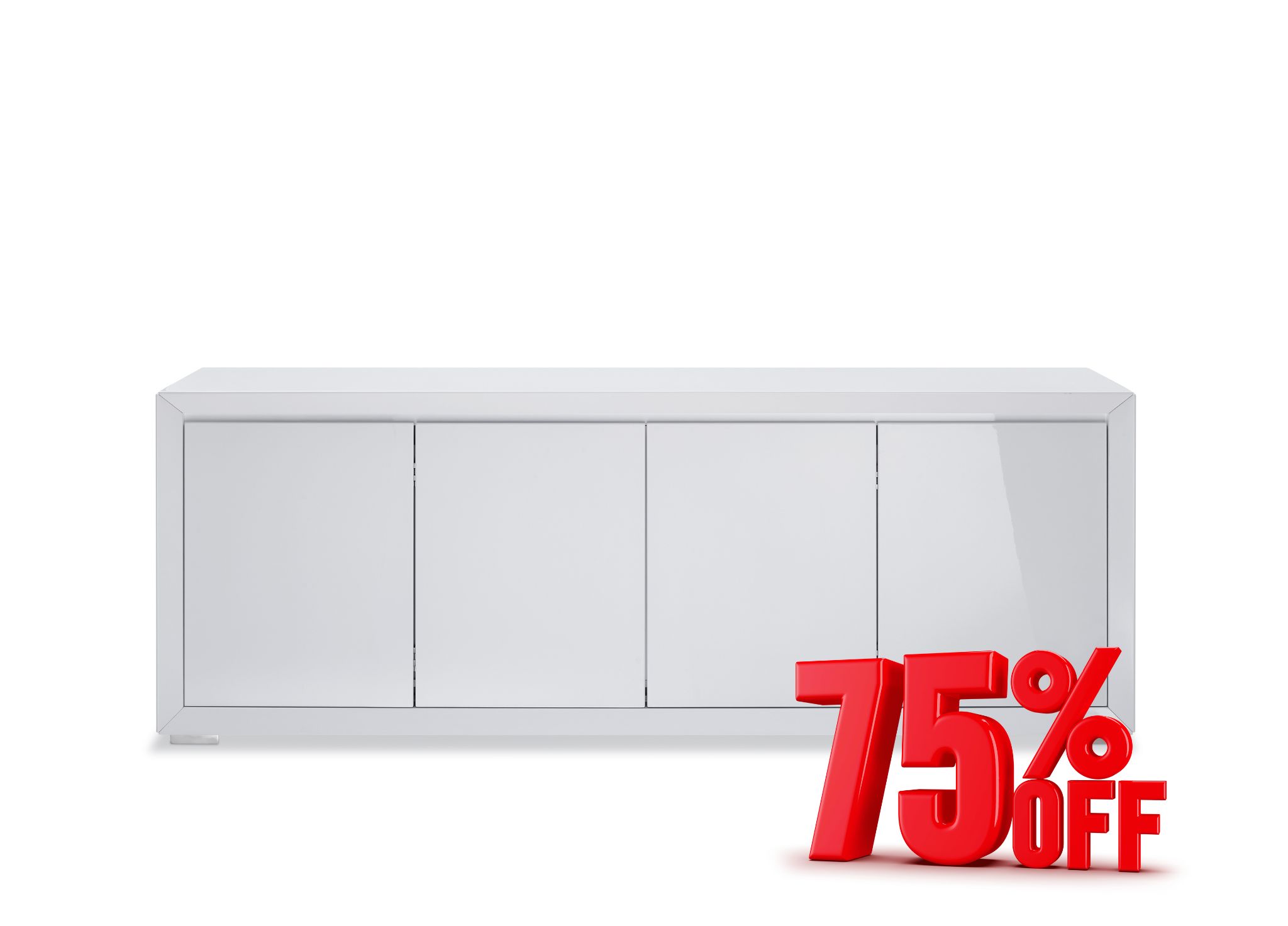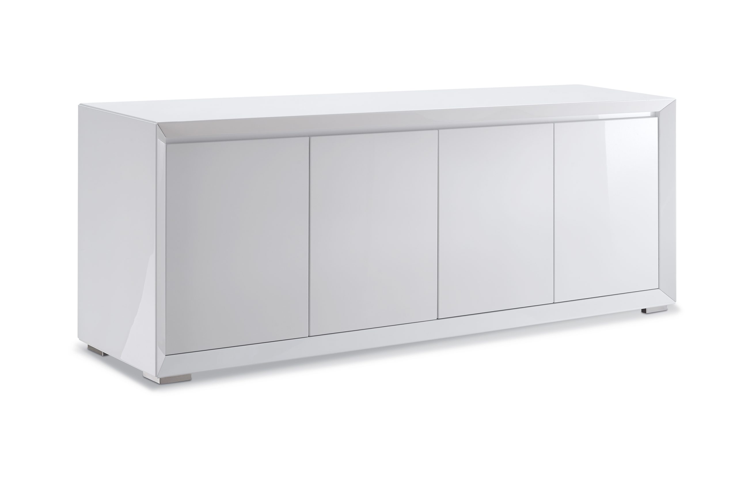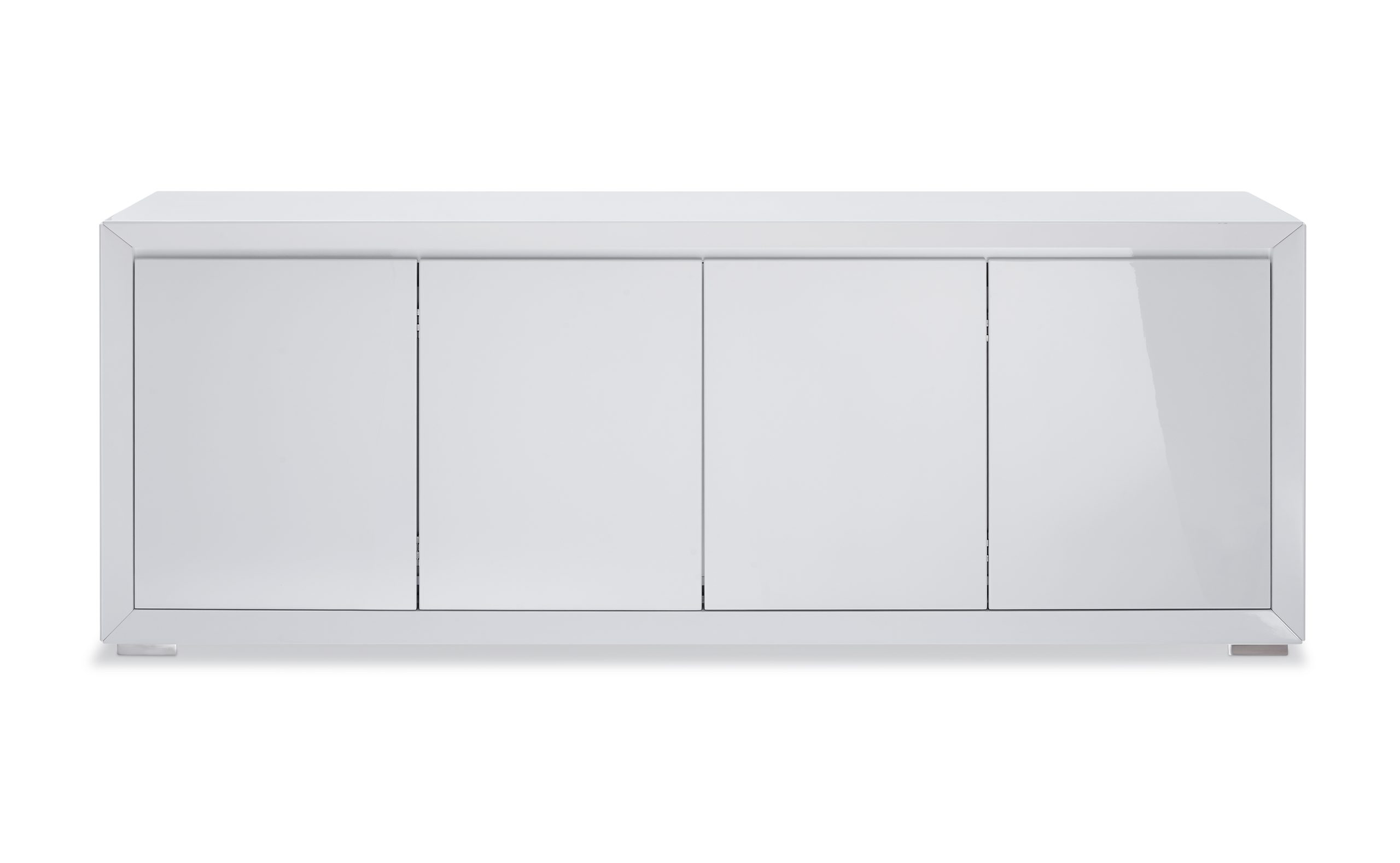 Pendenza Buffet 4 door MDF in high gloss white and polished stainless steel body with matte behind doors.