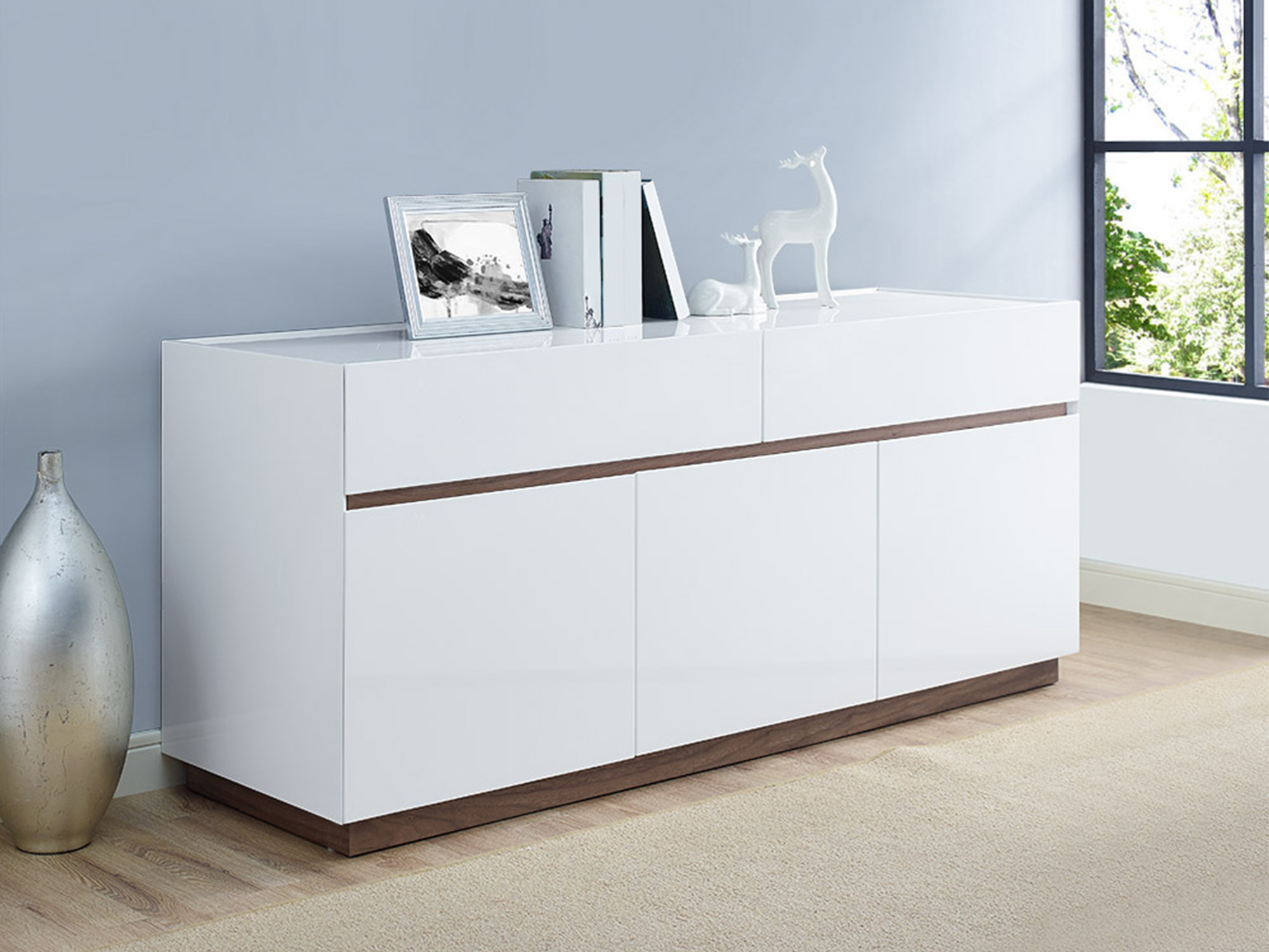The Serena Buffet brings modern sophistication and functional design together in one striking piece. Finished in a sleek high-gloss white, it is beautifully complemented by rich walnut veneer accent trim and a matching base for a warm, contemporary contrast.