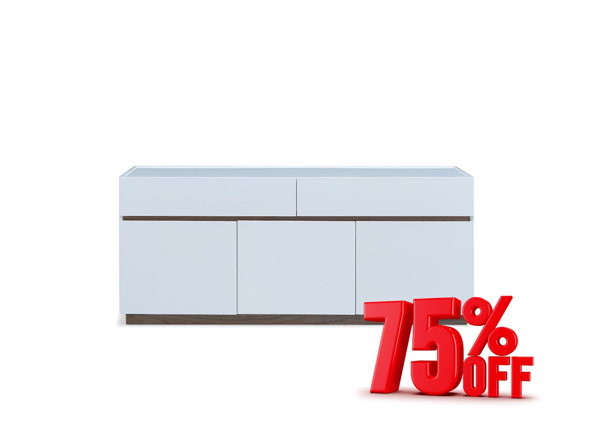 Serena Buffet high gloss white with walnut veneer accent trim and base 2 large drawers and 3 doors with self-closing hardware 1 wooden shelf inside each door