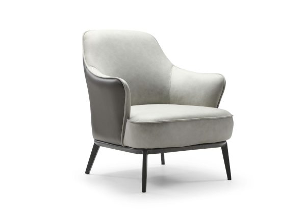 Sunizona Leisure Chair, Front in Waterproof Light Grey Fabric, Back in Dark Grey Faux Leather, Legs in Sanded Black Powder-Coated Steel.
