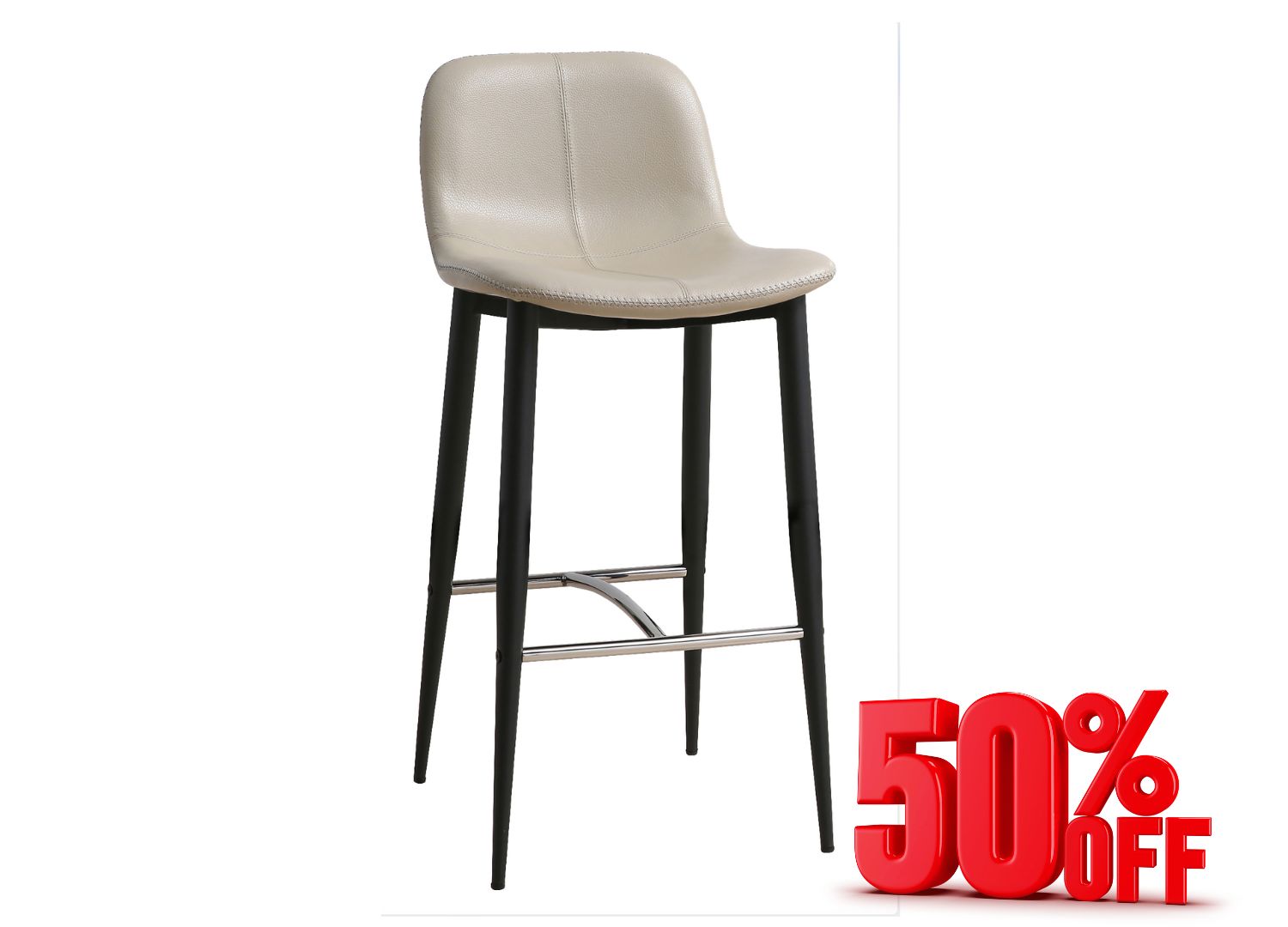 Franklin Barstool available in Taupe Faux Leather with Light Grey Stitching, Matte Black Powder-Coated Legs, and Silver Stainless Steel Footrest.