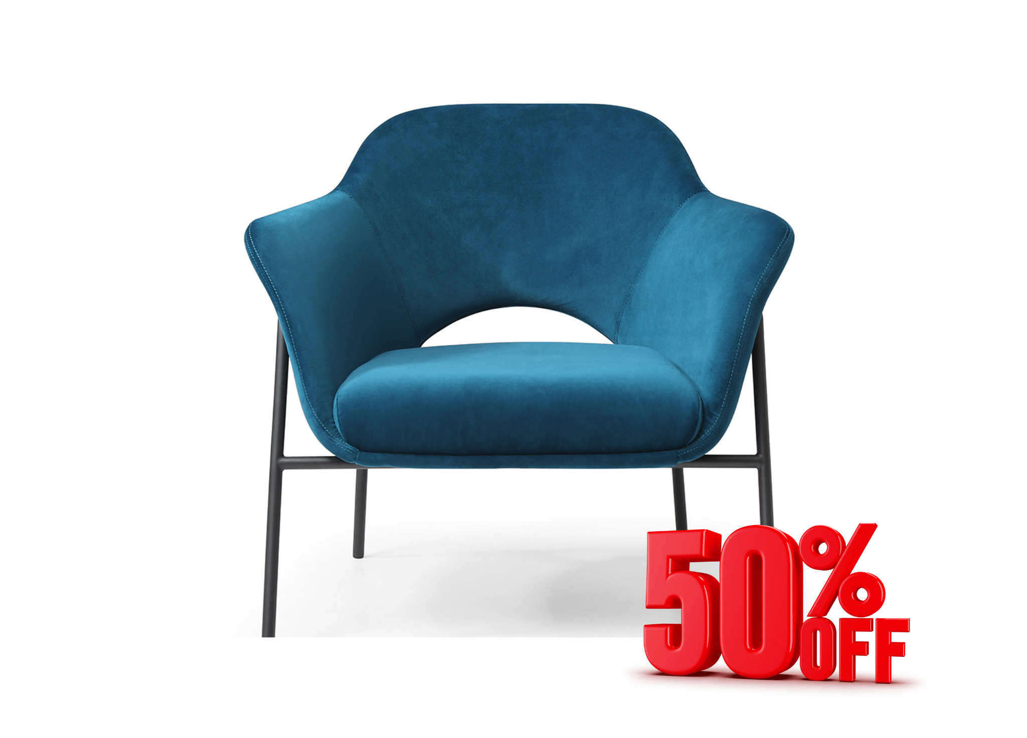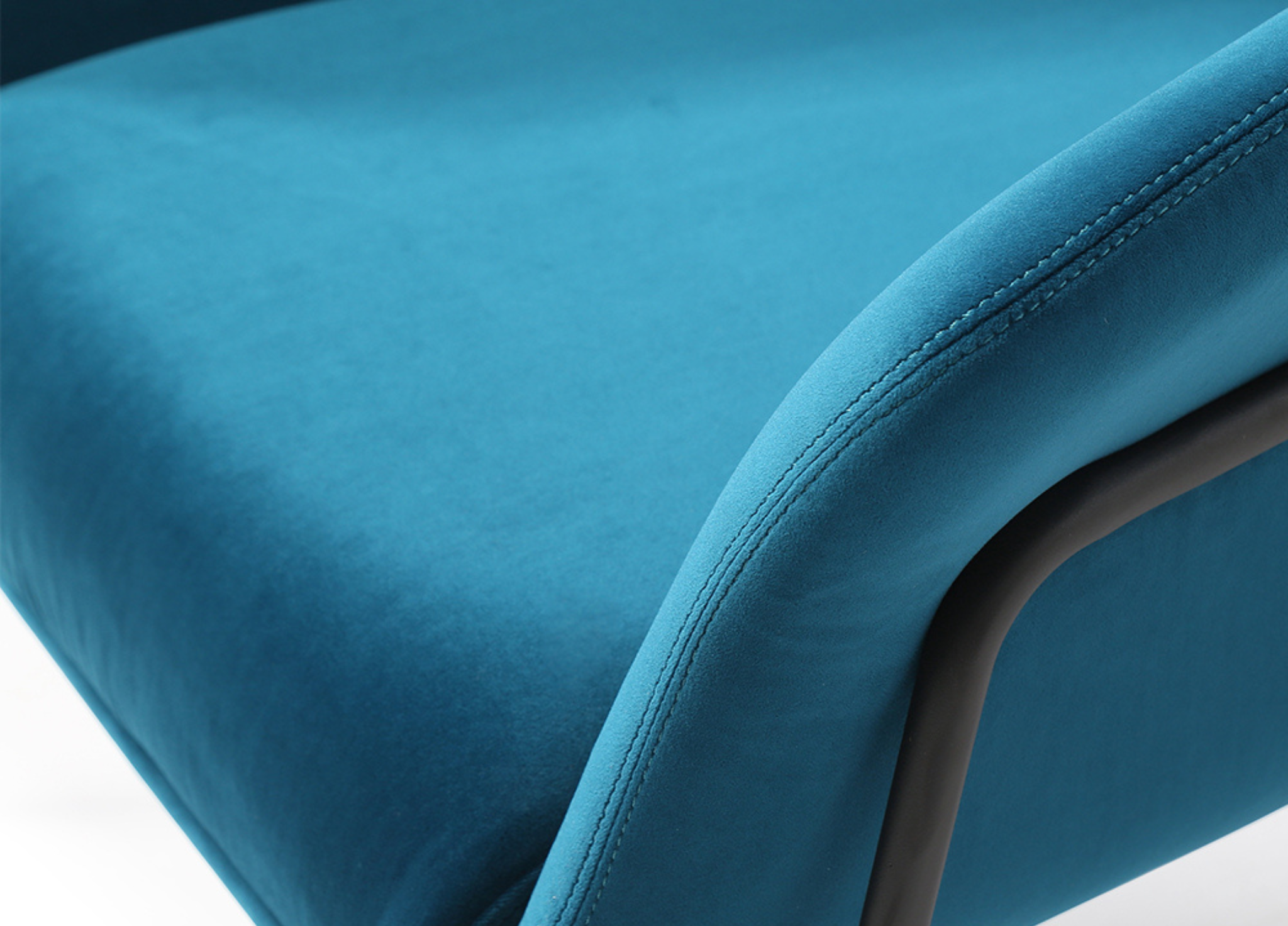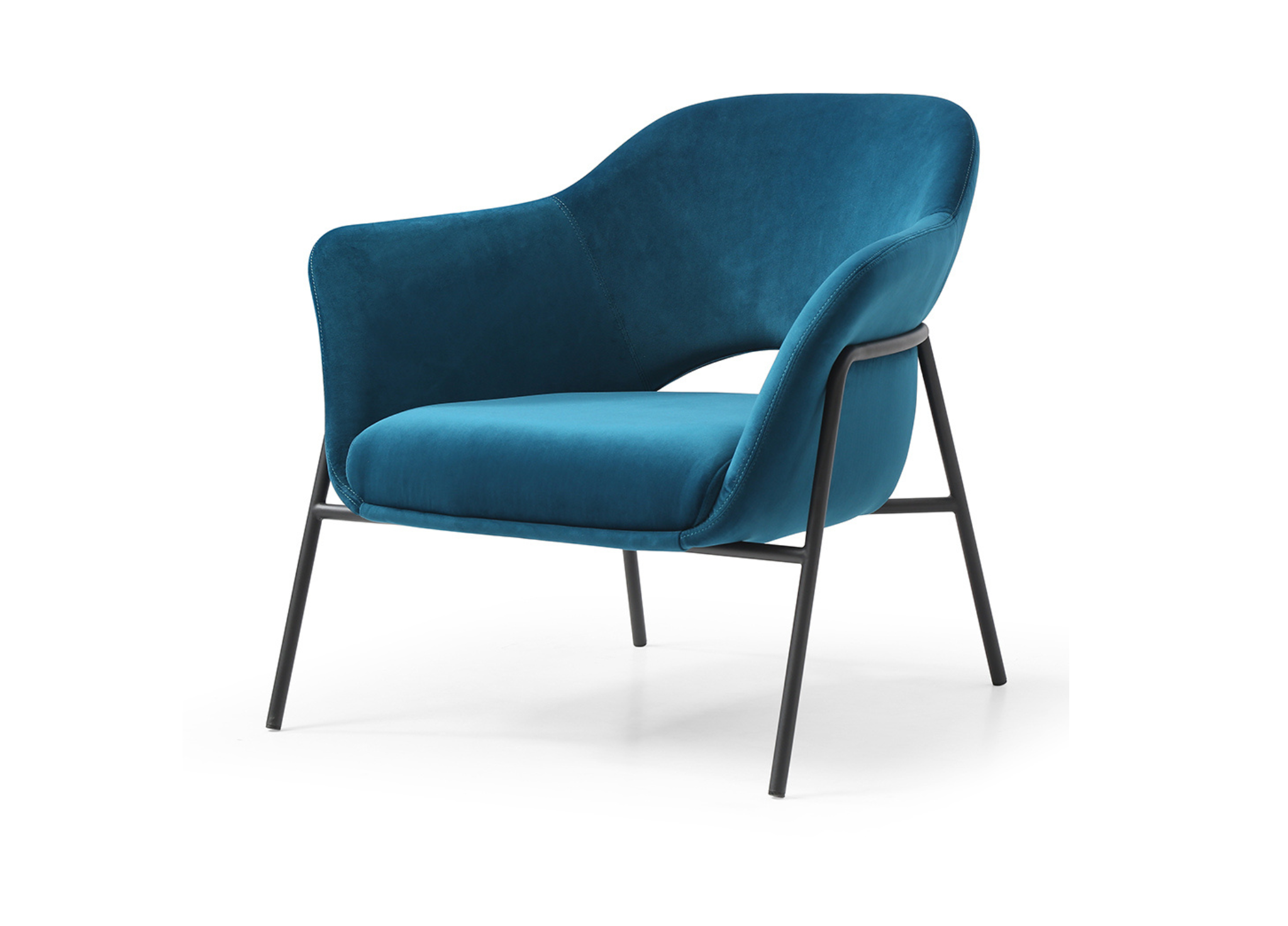 Karla Leisure Armchair, Available in Blue Velvet, Sanded Black Coated Steel Base.