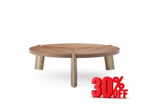 Mimeo Large Coffee Table, Round Top in Walnut Veneer, Base in Brushed Brass Stainless Steel.